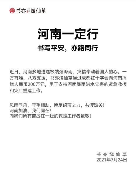 企业内部第一时间发起号召:“公司全体员工:一方有难,八方支援。全体书亦人在人力行政中心倡议下,心系河南,积极奉献爱心,为灾后重建与恢复生产贡献力量,截止7月26日16:30,微信募捐47531.41元,支付宝募捐29416.76元,合计77248.17元,上过款项已全额转入公司账户。公司定将善款专款专用,全部用于河南受灾地区的灾后重建。感谢全体书亦人的爱心与力量,书亦人与河南人民同在,祝河南人民早日战胜灾害!恢复正常生产生活!”