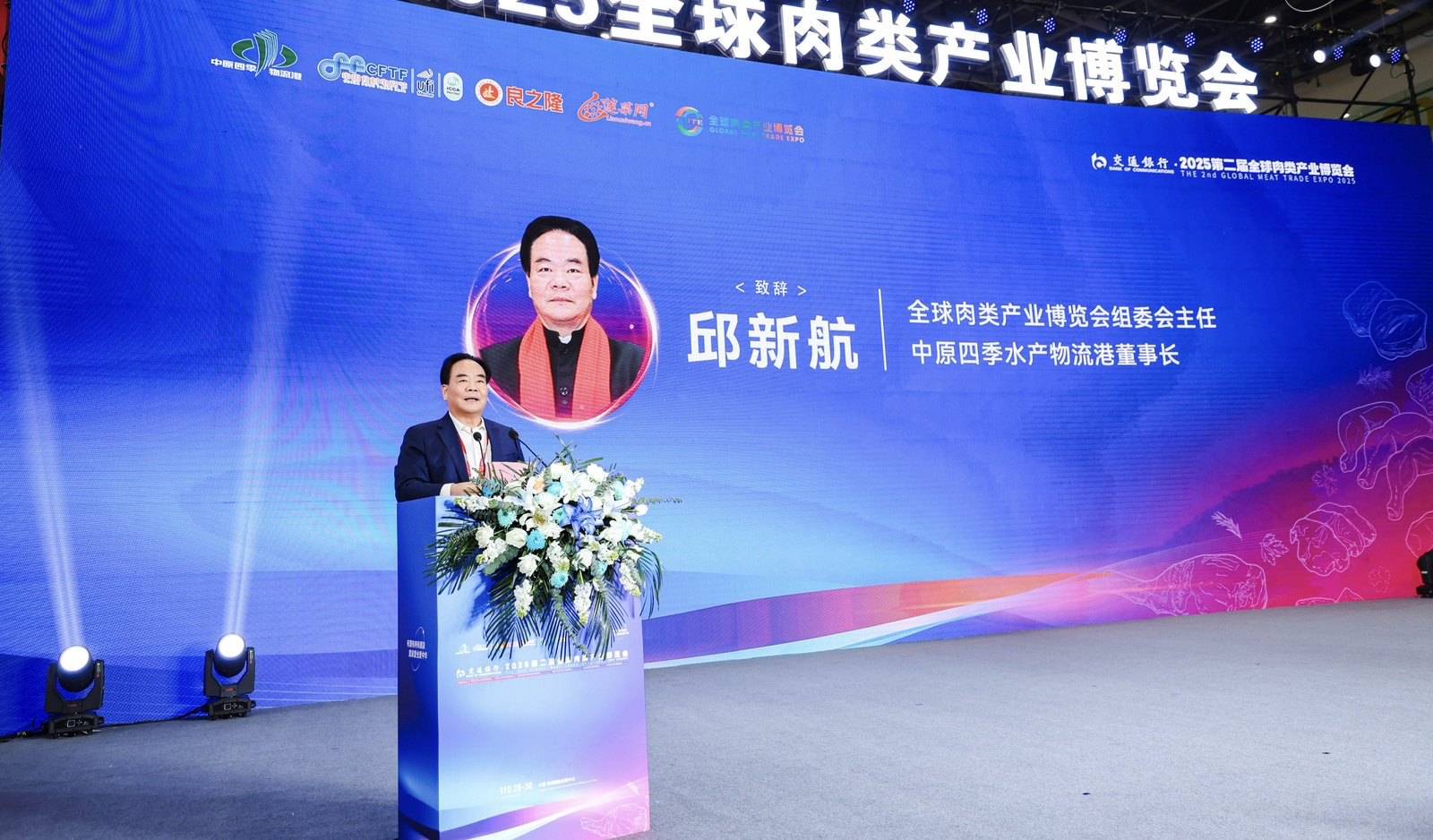 全球肉类产业博览会组委会主任、中原四季水产物流港董事长邱新航在致辞中指出,本届肉博会致力于从三大战略维度持续深耕:一是深化“平台经济”战略,强化肉博会作为行业关键基础设施的定位,让信息、技术、资本、商品在此高效流通;二是启动“文化赋值”工程,深入挖掘中原大地、豫菜之乡深厚的饮食文化底蕴,为现代肉类产业注入独特的历史韵味与文化魅力,让舌尖上的美味承载更多故事与情怀;三是布局“数字孪生”展会,打造一个打破时空界限、全年无休、全球可访问的线上肉博会,将线下3天的精彩,延伸为线上365天永不落幕的合作平台,持续激发产业动能。
