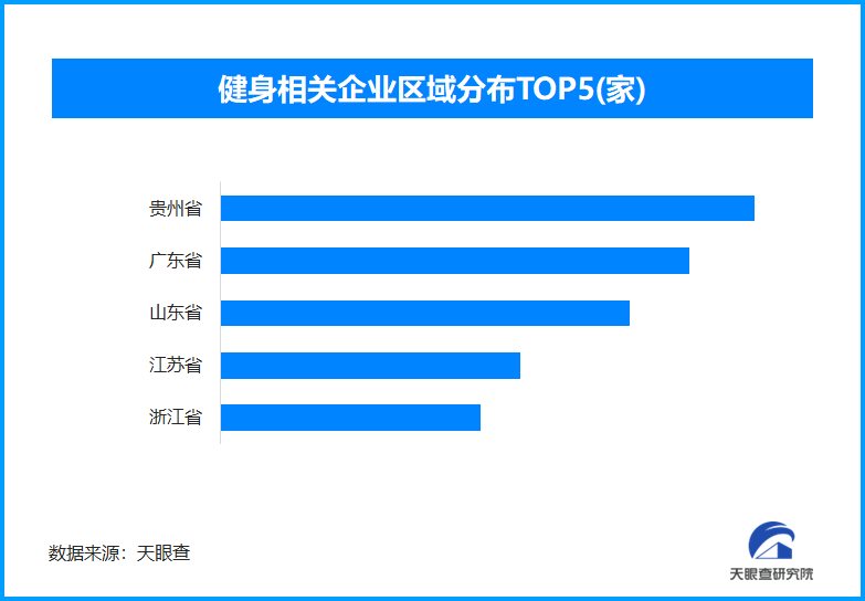 天眼查专业版数据显示,截至目前我国现存在业、存续状态的健身相关企业超163.6万家。从区域分布来看,贵州省、广东省、山东省、江苏省健身相关企业数量位居前列,四个省市数量总和超过59万家,占企业总数的36.07%。