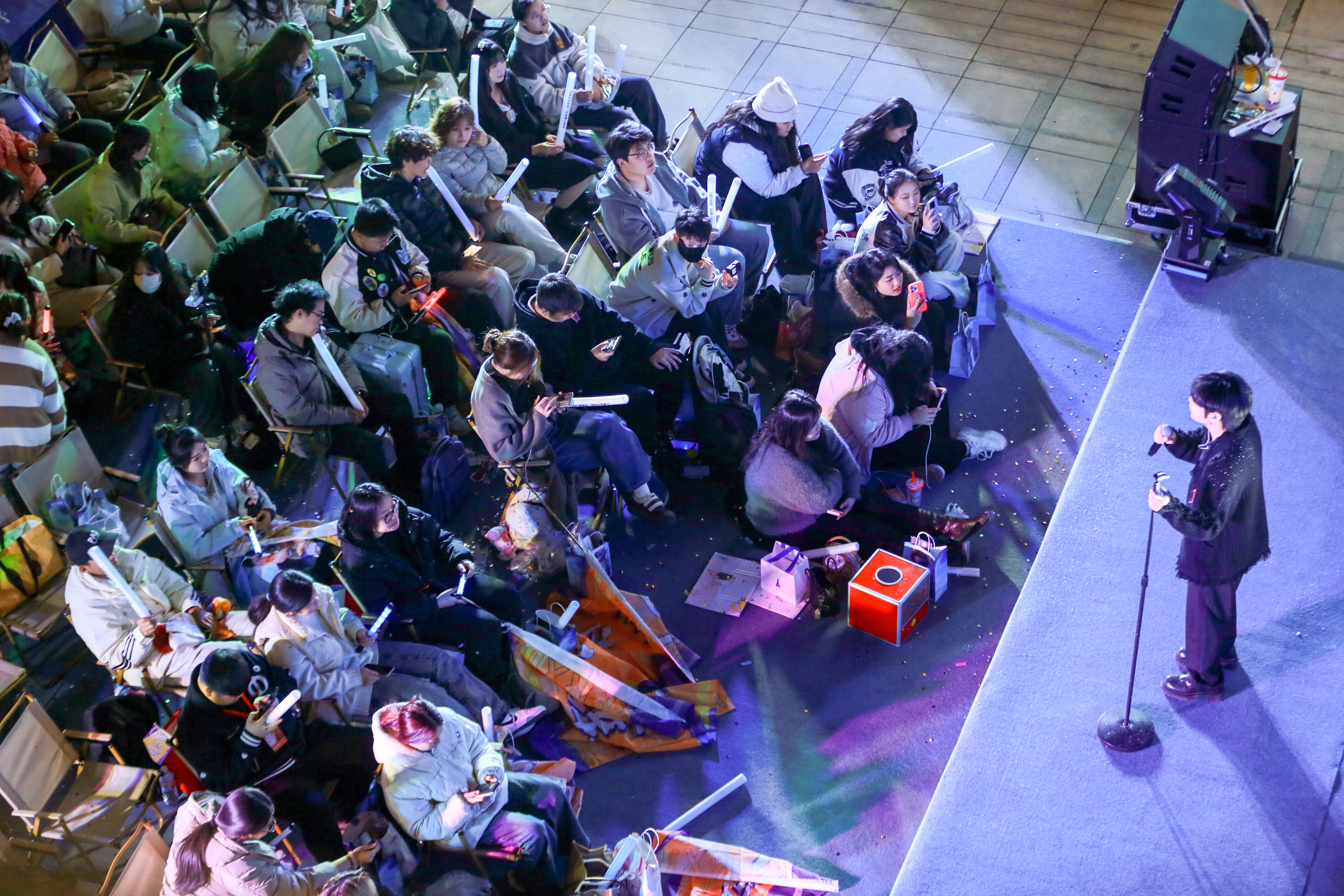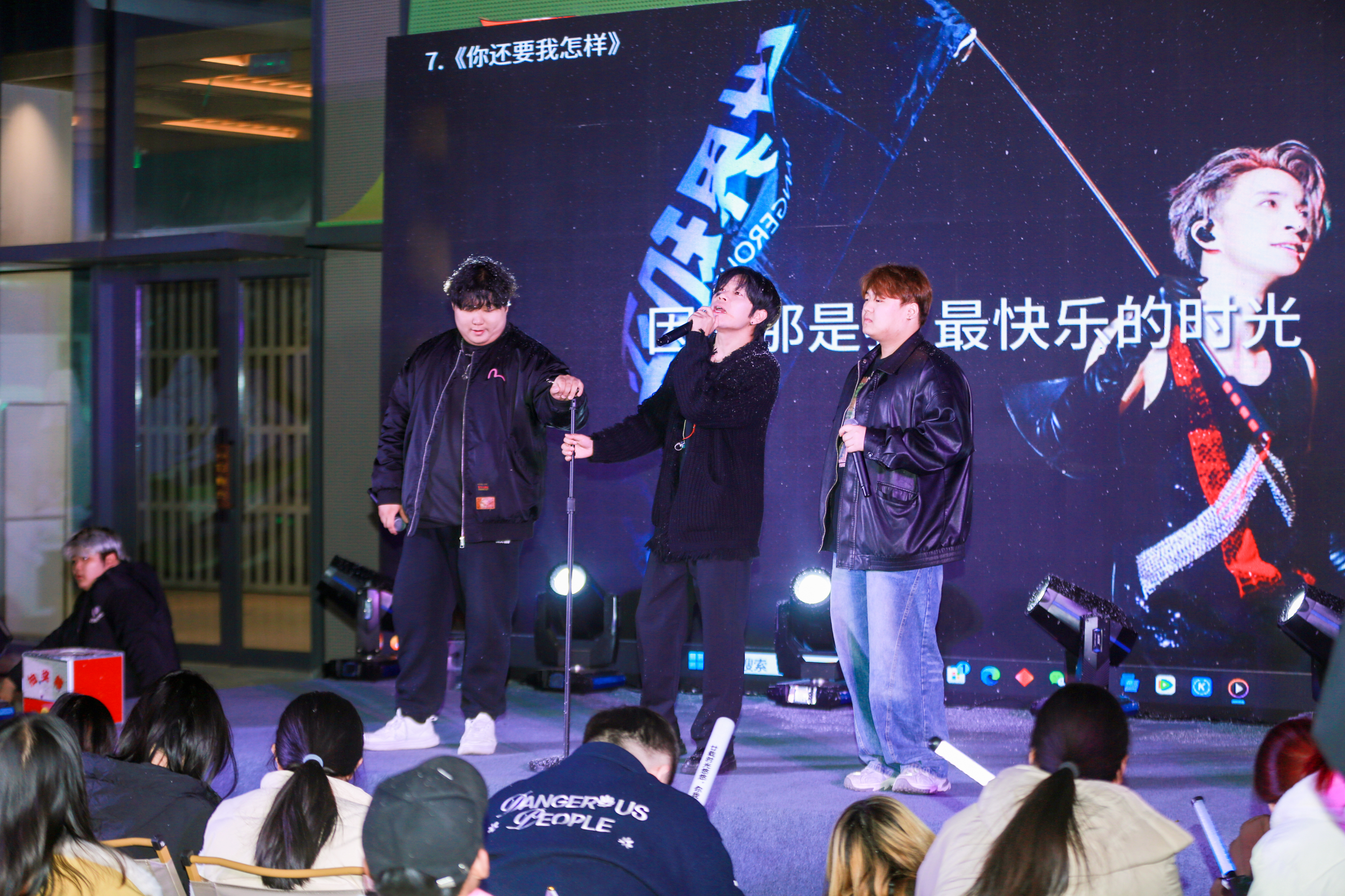 随着夜幕降临,演出正式开始。专业歌手登台与观众互动,瞬间点燃全场热情。当《天外来物》的前奏响起,谦友们的多巴胺被迅速唤醒,大家默契地挥舞着荧光棒,现场气氛十分热烈。一首首耳熟能详的曲目轮番上演,将气氛推向高潮,全场观众齐声合唱,歌声随晚风漫过人群,回荡在城市夜空中,满是纯粹的快乐与美好。