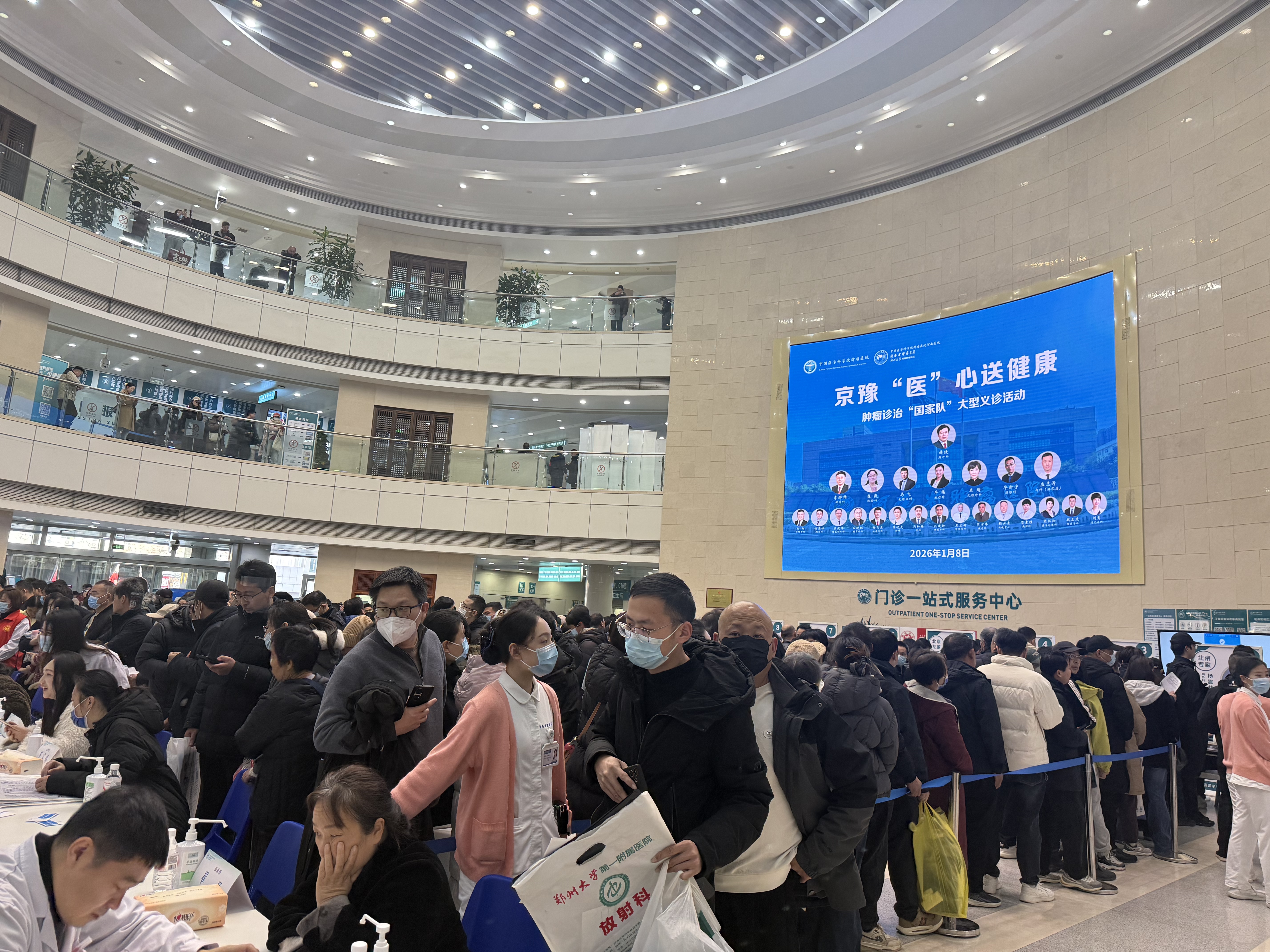 1月8日,中国医学科学院肿瘤医院河南医院(河南省肿瘤医院)门诊大厅熙熙攘攘。来自全省各地的患者拎着病历袋、CT片子,等待排队就诊。