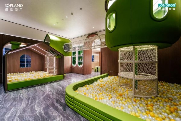 郑州的室内篮羽复合馆,以净高约7米的豁达尺度与18米超长玻璃幕墙,将天光与活力一同引入;近9米高的双层“魔树”探险乐园,由百年香樟原木打造,攀爬、滑梯、瞭望与泡泡池交织成孩童的梦幻王国,所有触面皆遵循儿童环保标准,让自然野趣与安全守护并行不悖……