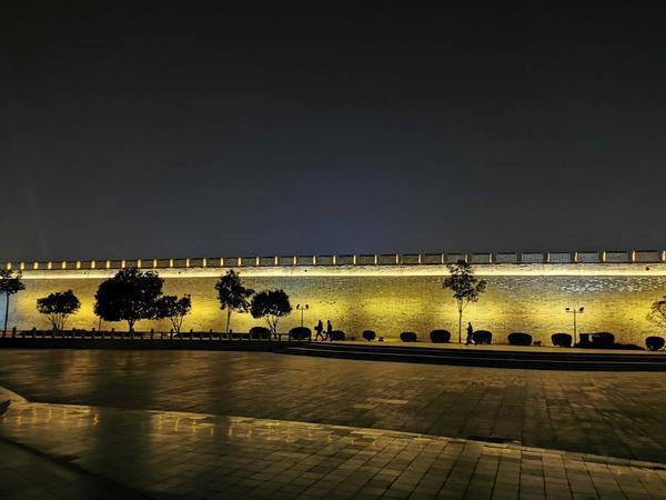 城墙上,三三两两的人群或在城墙上漫步,或席地而坐,依靠着历史的遗迹感受古城的文化和安逸;城墙下,川流不息的车流与路两旁花坛上的景观灯交相辉映,叠加起来,像极了一条红白黄相间的彩色丝带。
