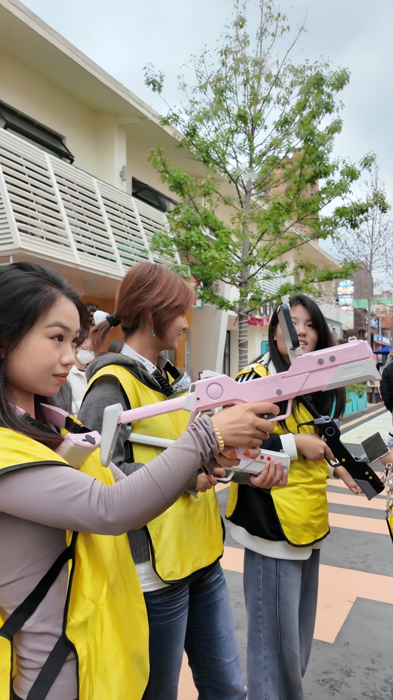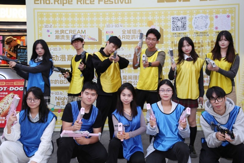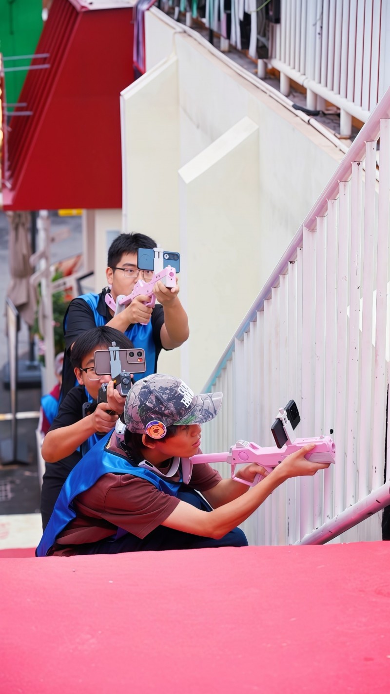在米房入口,AR竞技区的欢呼声此起彼伏。一群小学生正兴奋地领取游戏道具,准备参加“全域狙击 AR吃鸡行动”。他们手持装备,迫不及待地对着空气比画瞄准,跃跃欲试。