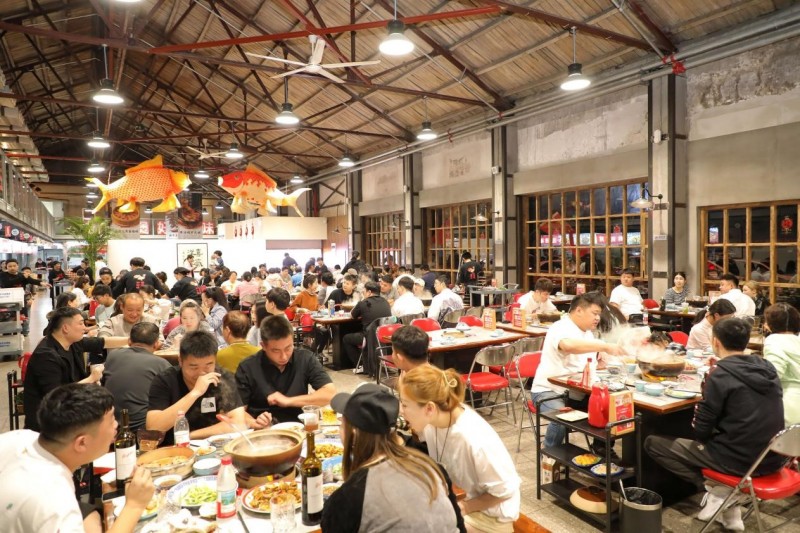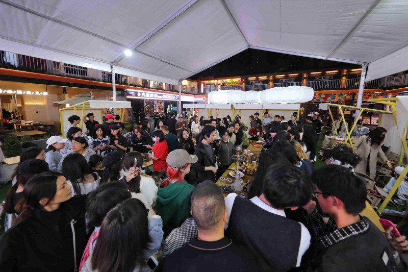 街区里,各色餐饮档口冒出袅袅升腾的白烟,交织着诱人的食物香气。园区餐厅的户外区域座无虚席,食客们一边享用着热气腾腾的美食,一边欣赏不远处舞台的表演,不时有年轻人兴奋地站起身,高声呼唤着朋友加入这热闹的阵营。