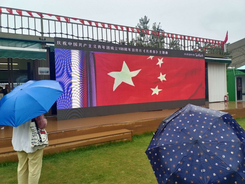 几位家长撑着伞,陪着身旁的孩子,在雨中驻足凝望。屏幕上正播放着庆祝中国共产主义青年团成立100周年宣传片《共青春》,磅礴的音乐与雨声交织。一个小男孩看得入神,不自觉地跟着旋律轻轻哼唱起来,稚嫩的嗓音在哗啦啦的雨声中格外清晰。